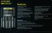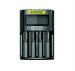 Štiri-vtični USB polnilnik za vse običajne baterije za svetilke. Standardni polnilni tok 1x 1,5A/ 2x 1A/4x 0,5A. Preko načina hitrega polnjenja 1x 1,5 A / 2x 1,5 A / 4x 0,75 A. Zaslon z vsemi pomembnimi informacijami o stanju in funkcijo varčevanja z energijo. S funkcijo reaktivacije za globoko izpraznjene litij-ionske baterije. Primerno za Li-Ion, IMR, NiCd in NiMH baterije (18650, 16340, 26500, 14500, 18350, AA, AAA, C, D itd.). Dimenzije 159 mm x 107 mm x 41 mm.