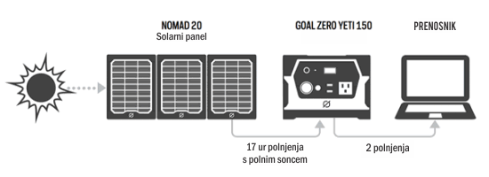 To je Plug-And-Play (priklopi in igraj), brez izpustni in izredno tih akumulatorski napajalnik ki je namenjen za nujne primere, kampiranje ali pa za kakršnokoli napajanje. Goal Zero Yeti 150 je akumulator, ki za delovanje ne uporablja naftnih derivatov in ki lahko polniluči, telefone in prenosnike v kakršni koli situaciji.