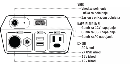 Izhodi: USB, 12V in AC