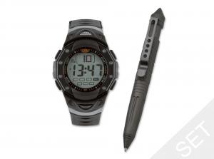 Vedno pripravljeni z novim UZI darilnim setom. Digitalna ura ima funkcije alarma, datuma in osvetlitve.  Vodoodporna do 30 m (3 bar). Premer: 45 mm. Taktično pisalo je izdelano iz visoko kvalitetnega letalskega aluminija in zagotavlja odličen oprijem. Vključuje običajni standardni velik vložek. Jeklena sponka omogoča varno shranjevanje.