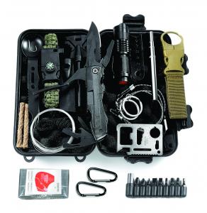 Komplet profesionalne opreme za preživetje vključuje svetilko, izvlečno pihalno cev, piščalko, požarno strgalo, žično žago, zapestnico iz paracorda, večnamensko kartico, žepni nož, sponko za steklenico D-vode, odejo za nujne primere, ribiško opremo itd.